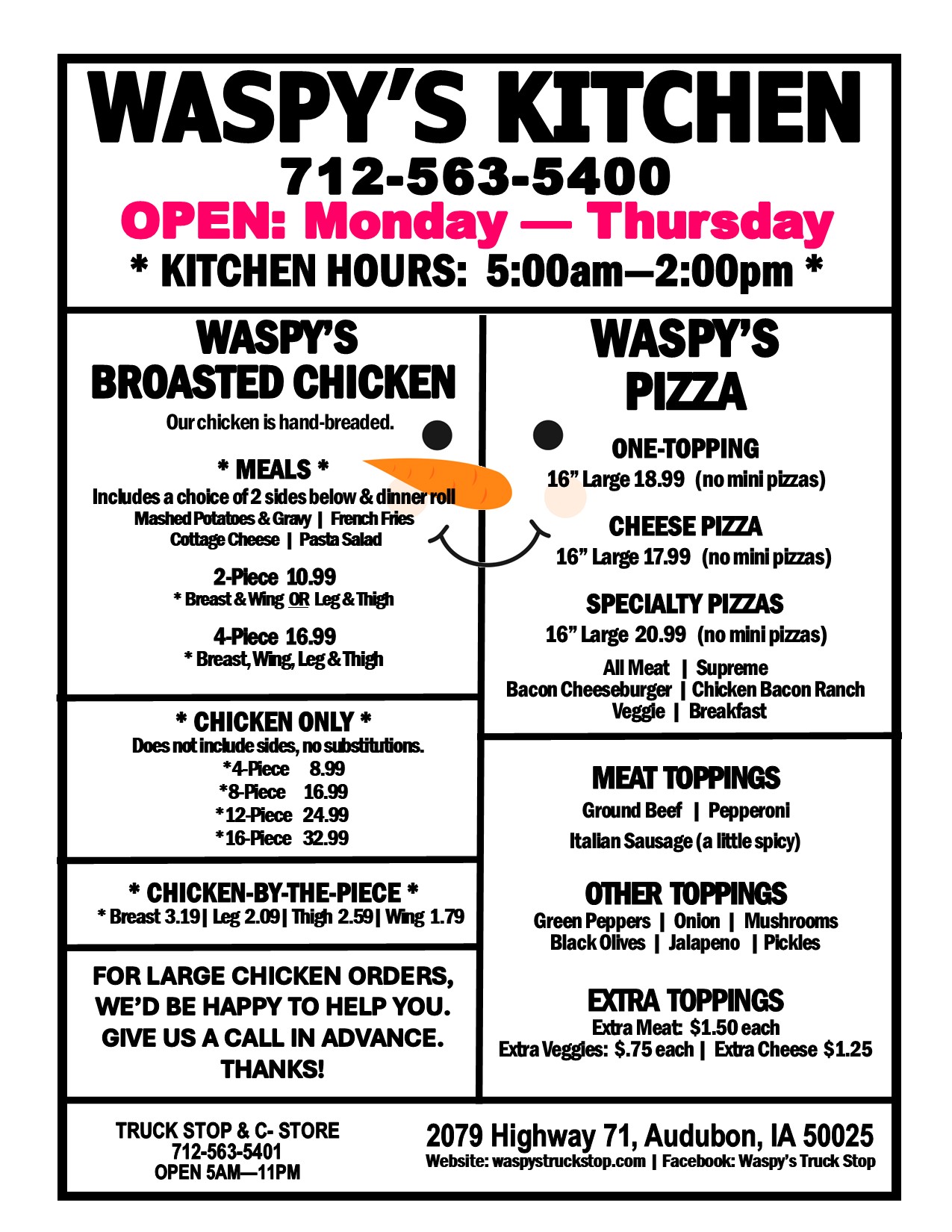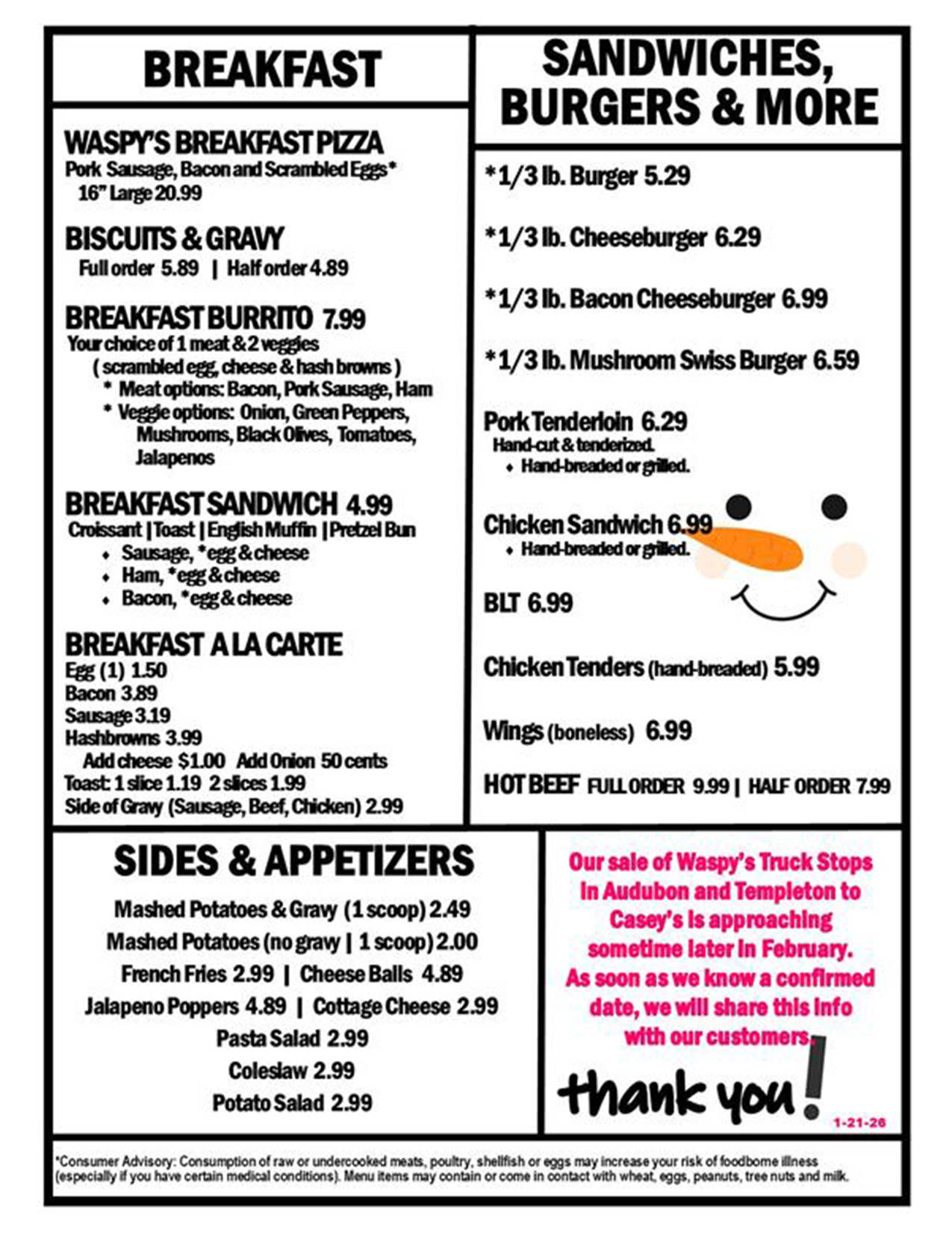If you’re on the go, you’ve come to the right place. At Waspy’s in Audubon, our convenience store has fresh, grab-and-go meals that are better than processed food. The Audubon IA grab-and-go menu is full of tasty options! Whether you’re looking for a sandwich, fried chicken, or a wrap, we have menu options for everyone.