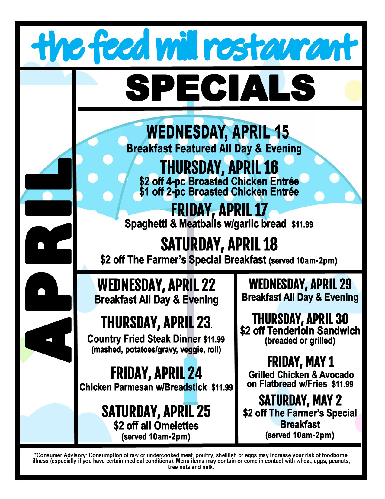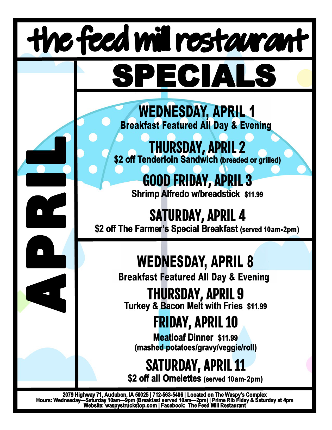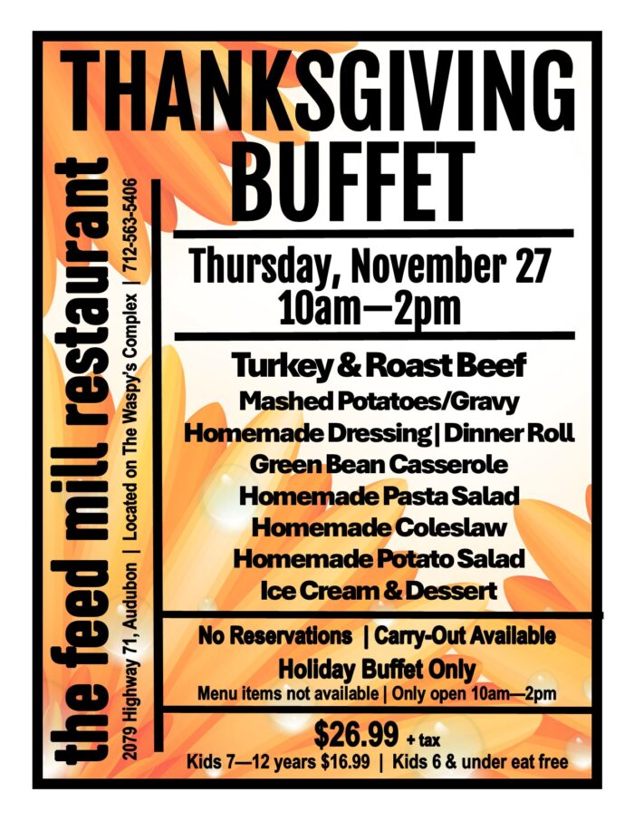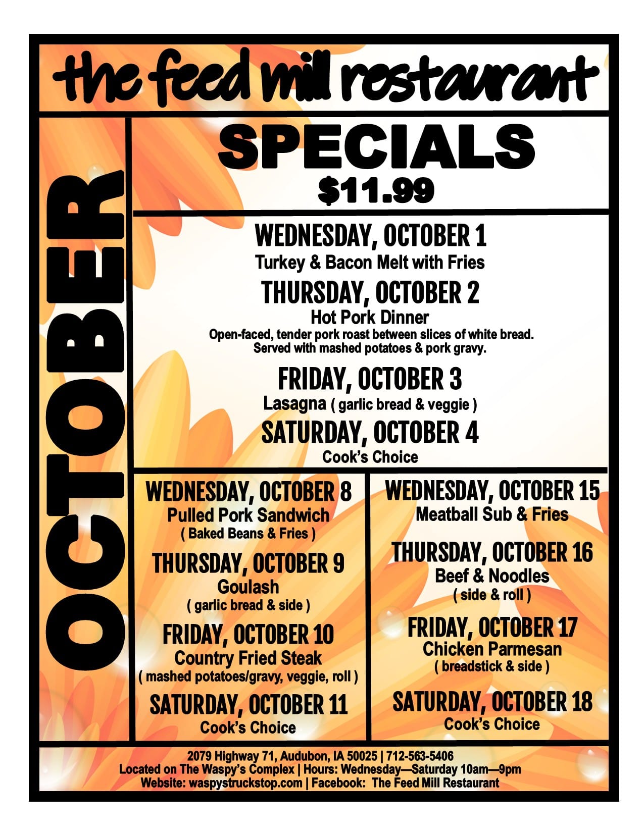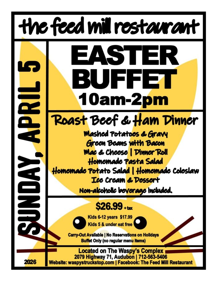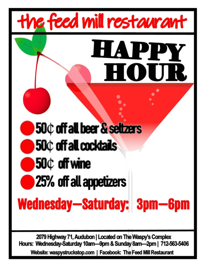 Located at 2079 Highway 71, Audubon, in the Waspy’s Truck Stop complex, The Feed Mill is open Wednesdays through Saturdays.