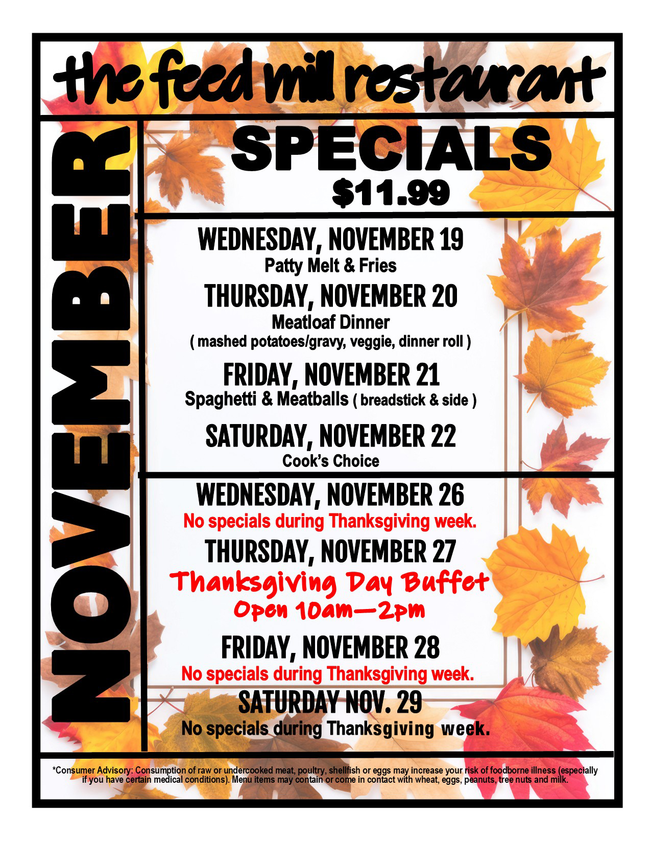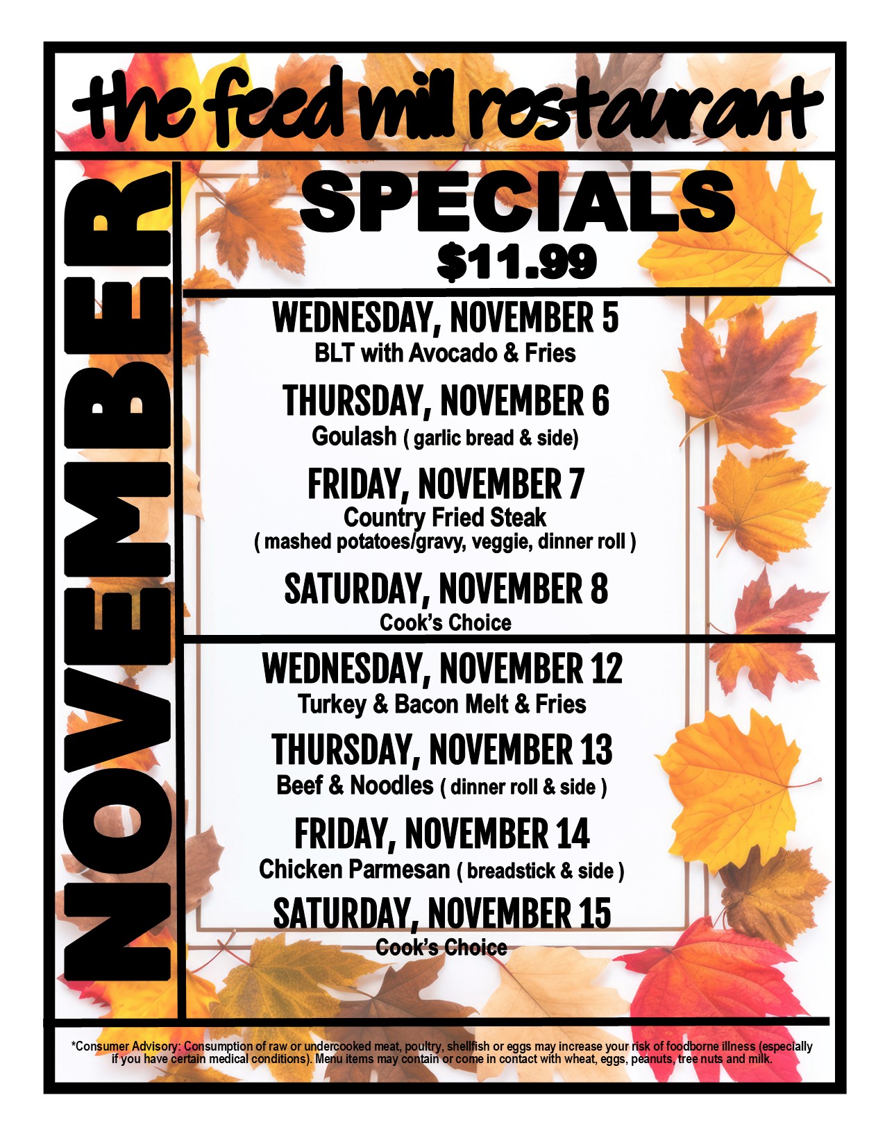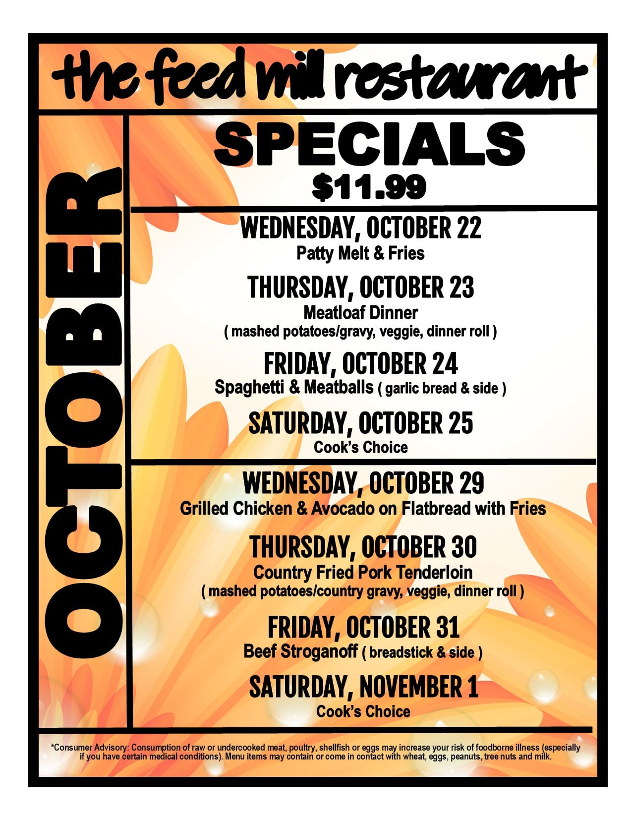 In the mood for a hot sandwich or chicken wings with your choice of sauce? If you want something more substantial, the Feed Mill Restaurant offer a range of entrees that include steak and seafood. Check out our menu below to find the selection that is right for you. Then peruse our variety of delicious sides and appetizers, ranging from fries and onion rings to cheese curds and vegetables.
